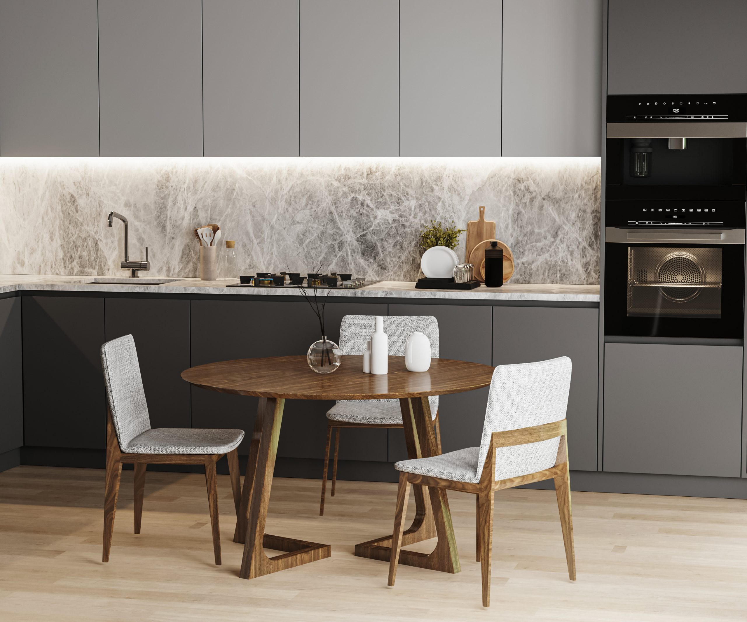 modern kitchen interior with table, kitchen utensils and furniture, kitchen appliances, 3d rendering