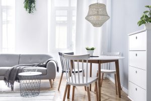 Stylish scandinavian living room with design furniture, plants,